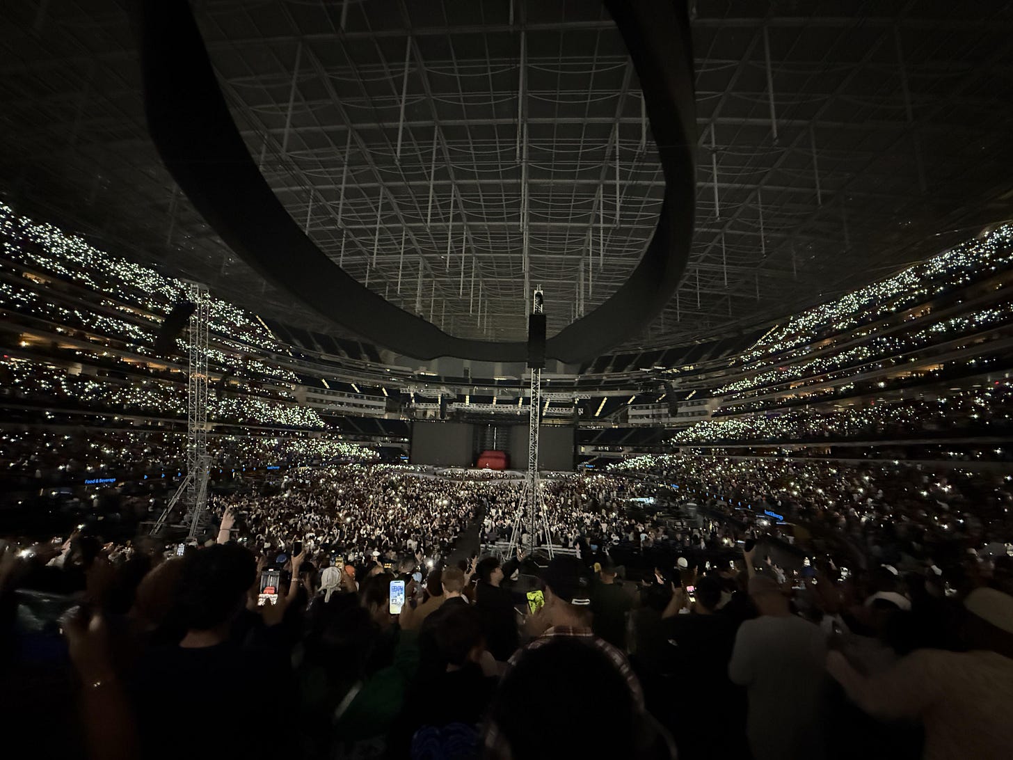 Act 1 began exactly as the run-down had promised. The sharp synth-bass stab of “Wacced Out Murals,” straight into the pummel of “Squabble Up,” “King Kunta,” and an adrenalized “ELEMENT.” As Lamar gets the crowd going with the instrumental of Anita Baker’s “Angel,” he raps with aggression and side-by-side prowls down the central runway, easing into the introductory half of “TV Off,” the first of two installments that bookend the show. Their first genuinely quiet moment where Lamar and SZA shared the stage from the start, “30 for 30,” slipped into place six songs deep, Lamar retreating to harmonize beneath SZA’s lead; the hush lasted barely thirty seconds before “Love Galore,” “Broken Clocks,” and “The Weekend” reignited the bowl into a vast karaoke pit, each chorus fed by tens of thousands of camera-flash stars.