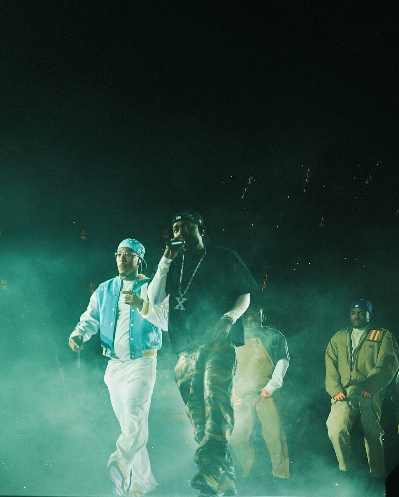 The house dropped to blackout, and the seven-note heartbeat that cues the unreleased “Bodies” filled the dark before transitioning to “N95.” Kendrick docked at center for the second performance of “TV Off” with Mustard and a group of dancers, a moment that welded the night into a perfect palindrome—the show began and would end on the same refrain. When “Not Like Us” detonated next, six flame cannons chased every snap, and the upper deck visibly shook; it was the only true pyro overload of the evening and felt designed to prove a point about local pride. “Luther” slid in as a gospel-soaked palate cleanser, SZA’s melismas coiling around Lamar’s half-sung cadences, and the pair closed the three-hour odyssey with “Gloria.”