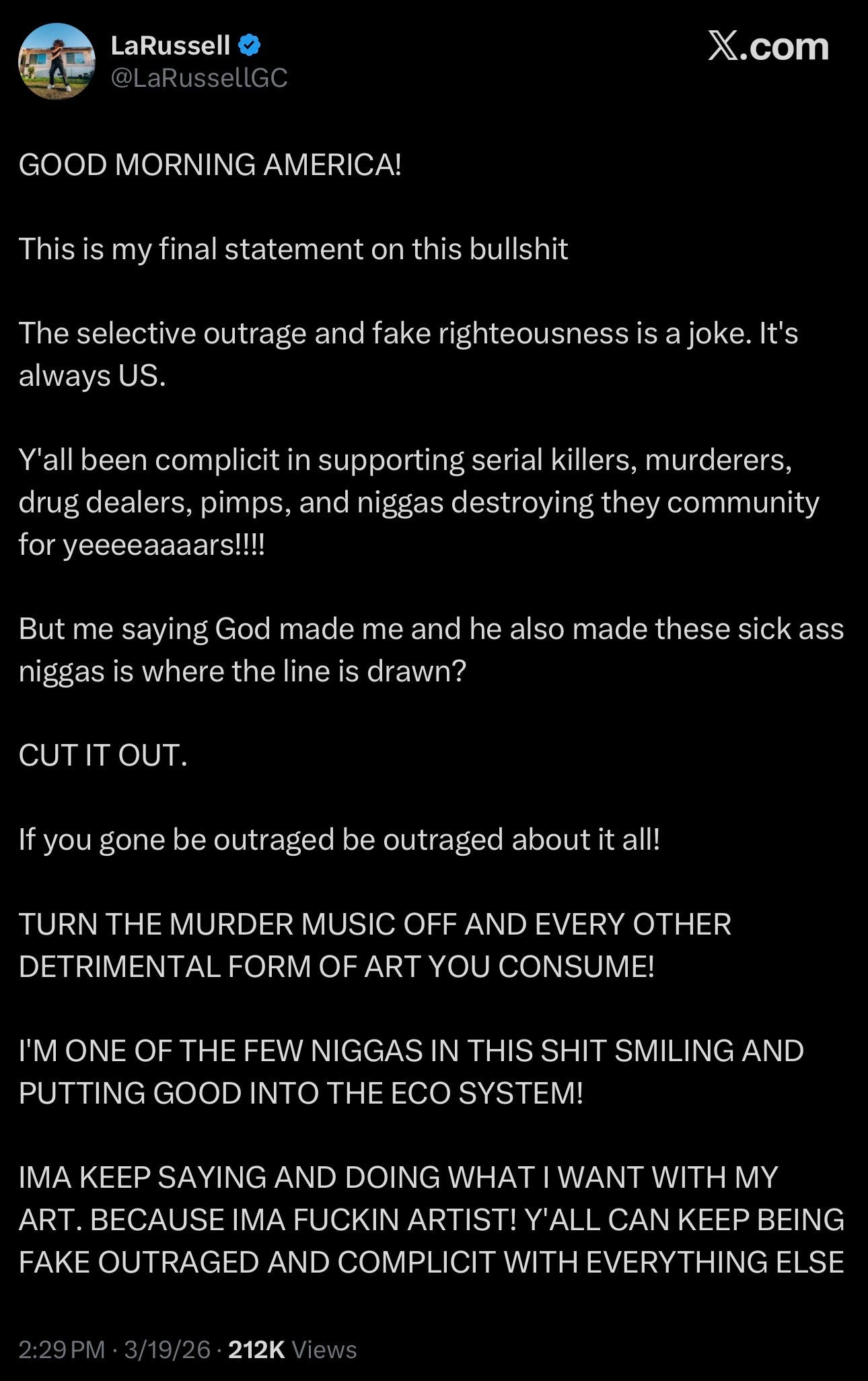 The song dropped February 26. It sat quietly for two and a half weeks until LaRussell staged the live performance and weaponized the engineer’s caution as a marketing hook. His defense, uploaded the following morning: “What do y’all think I’m saying in this song? Is it the truth that’s bothersome or is it what YOU think I’m saying? I’m saying every human was made by God. Even the evil ones. Even the niggas going to hell alongside some of yall uncles, daddies, and favorite rappers.” A day later, he added: “WE ALL HEAVEN SENT!!! NOT HEAVEN BOUND. ARGUE WITH YOU MOMMA OR BARACK OBAMA.” And in a five-minute video posted on March 17, he reiterated: “The same God, who created Martin Luther King and Malcolm X who did so many great things, is the same God that created Donald Trump and Jeffrey Epstein who did so many evil things.”