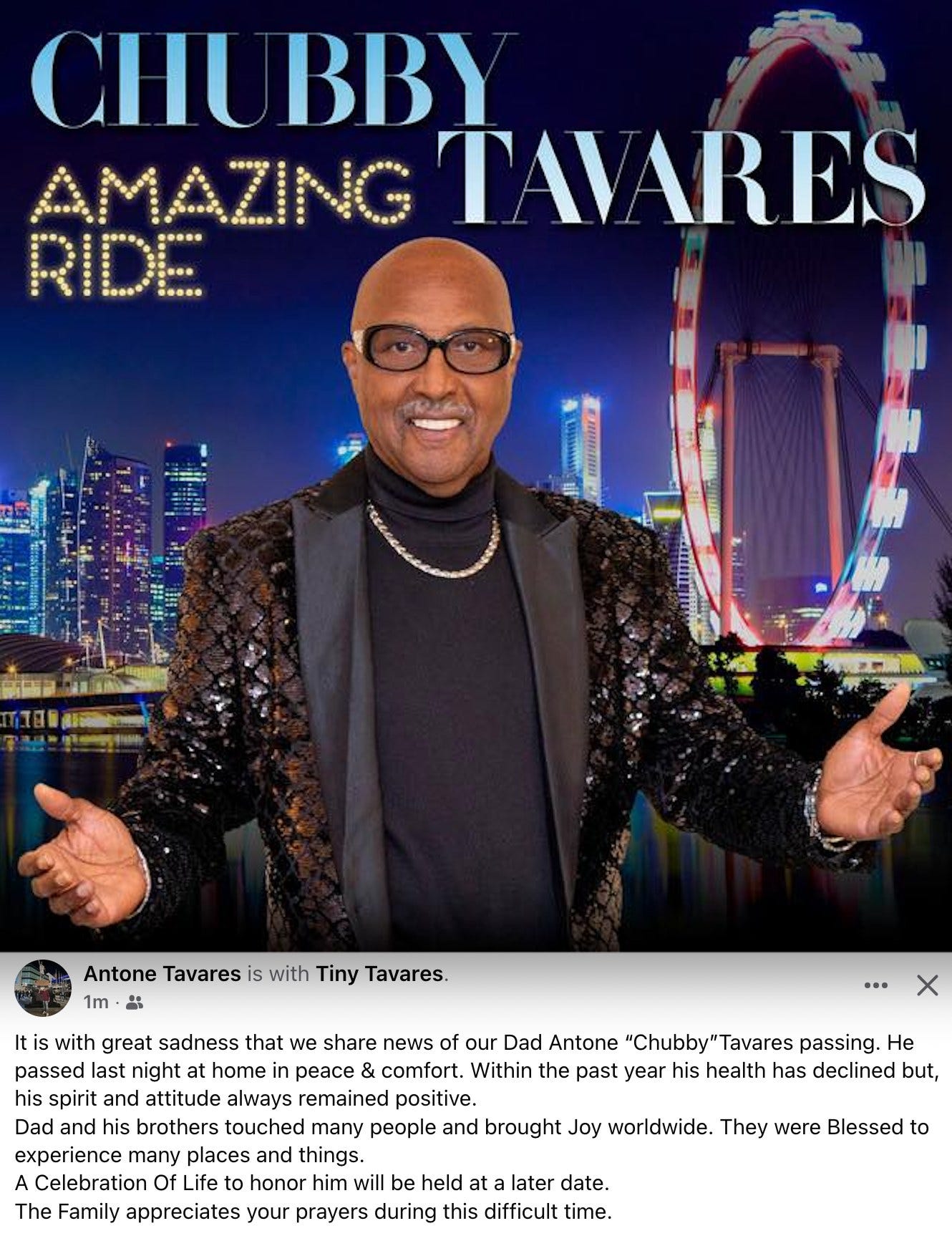 The story of Tavares spans more than fifty years, but at its core, it is a tale of brothers singing together. Chubby was the glue that held the harmony. His passing closes a chapter in American soul, yet the songs endure, and so does the example of a life lived with gratitude. The family has asked for prayers and remembrances as they plan a celebration of his life. In honoring that request, we also honor a singer who turned every stage into a gathering place. May we keep playing the records, share stories of kindness and perseverance, and remember Antone “Chubby” Tavares not only for his timeless voice but for the generosity and warmth that defined him.